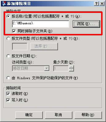 在添加排除项目中,添加MDameon的相关目录为排除目录,并排除子文件夹: