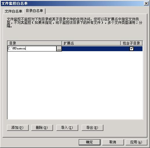在文件监控白名单中选择“目录白名单”,添加MDaemon的相关目录为白名单: