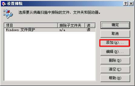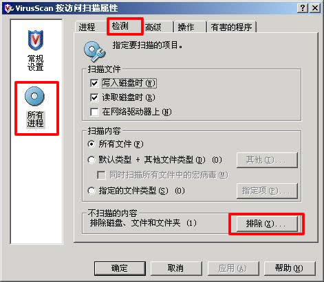 在按访问扫描属性中,点击“所有进程”,再点击右侧的“检测”,“排除”:
