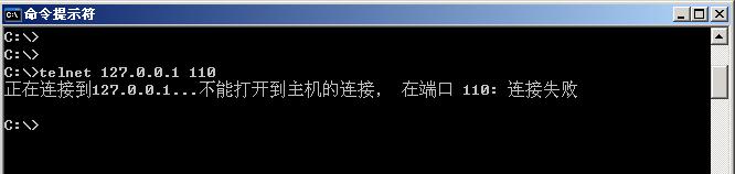 telnet 127.0.0.1 110 回车,如果直接显示连接失败,则POP端口无其他程序占用。