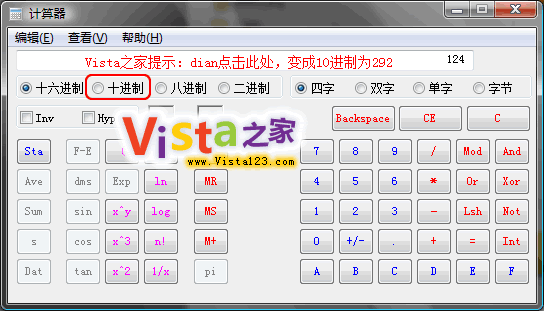 4、例如,你的蓝屏代码是0x00000124,计算器把124转换成10进制是292,截图如下: