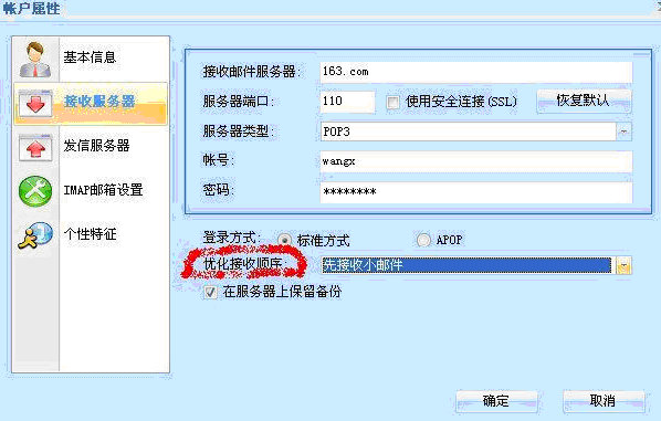 在账户属性中选择″接收服务器″,即从上到下第二个按钮,在″优化接收顺序″这个选项中选择″先接收小邮件″这个选项,然后确定。(见图二)
