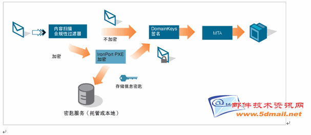 根据企业和合规性的要求,IronPort C系列设备的内容过滤器会识别将被加密的信息。一旦被加密后,IronPort PXE信息将继续通过电子邮件通道,被DKIM签名并传送。