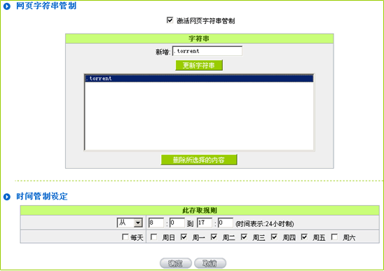 如上图,时间管制设定,填入时间管制的范围就可以了,结合下面的日期, 可以控制在工作天上班时间禁止BT的下载活动,如果要禁止所有时段, 即选择全部。按下确定按钮, 使设置生效。上面的设置是让字串管制在每个星期的星期一到星期五的8:00到17:30生效。
