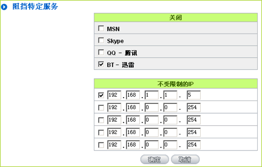 在路由器防火墙配置画面下面就提供阻挡特定服务栏,可以只“√”选BT,填入不受限制的内网IP就可以完成限制BT下载的目的,确认完成挡BT下载操作。
