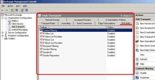 这样,我们就可以在Exchange的管理控制台-》组织配置-》集线器传输,看到“反垃圾邮件”的页签了。
