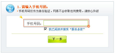 2.输入你真实、有效的手机号码。请注意:一个手机号码,最多可以验证126、163、yeah帐号各一个
