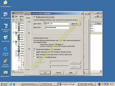 这时需要输入申请证书用户的用户名和密码,而且该用户必须在AD中存在才能申请成功.如果没有出现输入用户名和密码的界面,请打开"IIS管理"项,在"certsrv"的虚拟目录中取消匿名登陆.