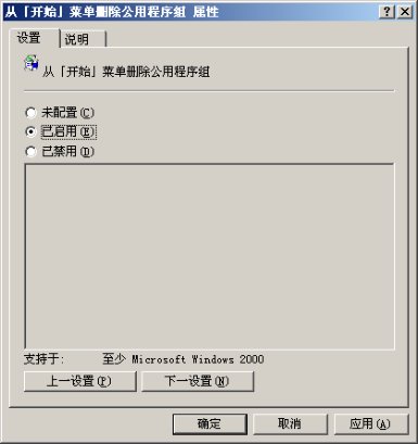 另外我们还可以借助组策略来完成,其操作更加简单。在“运行”中输入“gpedit.msc”,在打开的窗口左侧选择“用户配置—管理模板—任务栏和开始菜单”,双击右侧的“从开始菜单删除公用程序组”,将其设为“已启用”即可(图2),这样一来以后安装的程序将只有以当前账户登录才能在开始菜单中访问,其他用户登录将自动隐藏。