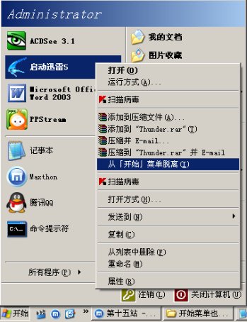 对于已经添加的应用程序,我们还可以在开始菜单中直接拖动改变它们的上下位置,而对于一些使用频率降低的程序还可以将其移走。其方法是在名称上单击鼠标右键,选择“从开始菜单脱离”命令即可(图4)。