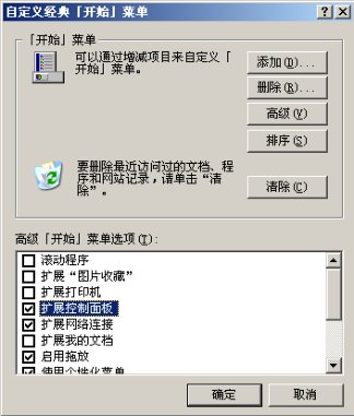 在开始菜单的空白处单击鼠标右键,打开其属性窗口,切换到“开始菜单”标签,这里有两种情况,如果采用“开始菜单”形式,那么只要单击其右侧的“自定义”按钮,然后将打开的窗口切换到“高级”标签,在“开始菜单项目”中将“控制面板”项设为“显示为菜单”即可;如果采用经典开始菜单样式,那么同样单击右侧的“自定义”按钮,然后在窗口中选中“扩展控制面板”选项,单击“确定”按钮即可(图5)。
