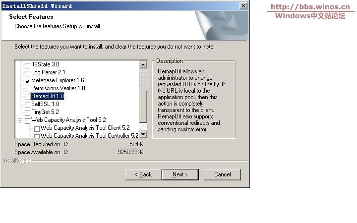 4.单击以清除除“Metabase Explorer 1.6”复选框以外的其他所有 IIS 资源工具包工具和组件复选框