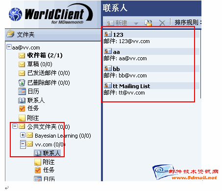 最后,看看应用的小例子吧:例如公共联系人,只要启用公共文件夹选项,并在服务器端建立相关账户,及列表用户/组用户之后,就会在web端显示出公共文件夹里的联系人了。