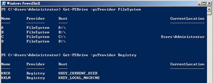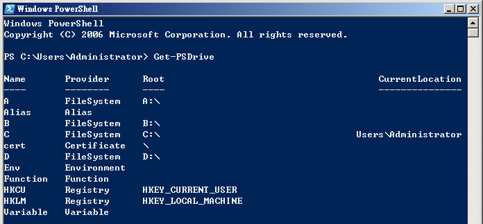 上述結果列出系統所有的 PS 磁碟機,最左欄的 Name 是 PS 磁碟機名稱,接著的 Provider 是該部 PS 磁碟機的提供者、 Root 是磁碟機的根目錄,而最後一欄 CurrentLocation 提示了目前 Windows PowerShell 環境的磁碟機及目錄位置(此例為 C 磁碟機的 Users \ Administrator )。