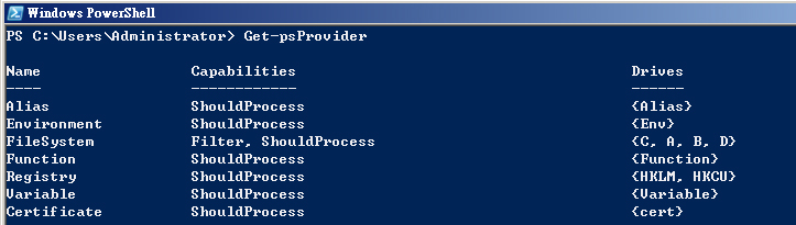 我們之所以能存取上述各種類型的PS磁碟機,其實是拜 Windows PowerShell 提供者( provider )所賜。提供者簡化了我們從 Windows PowerShell 命令列存取資料的方式,並且以類似檔案系統的格式來呈現透過提供者所存取到的資料。
