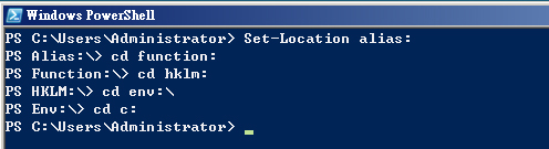 原本的 CMD 是以單一字母作為磁碟機的識別代號,這種作法在 Windows PowerShell 的 PS 磁碟機依然可行,只是原本稱為磁碟機代號,現在稱為磁碟機名稱(例如此例的 A、C、D),而原本的 CMD 是以磁碟機代號跟著冒號來切換磁碟機,現在也非常類似,只要利用 Set-Location cmdlet(或其別名 cd、chdir、sl),並以磁碟機名稱及冒號作為參數即可,例如以下的例子會從 C:\Users\Administrator 依序切換到 Alias、Function、HKLM、Env:\,最後又切回C,並且再切換到 C:\Documents and Settings; 操作時請記得,磁碟機名稱之後要跟著一個英文半形的冒號。