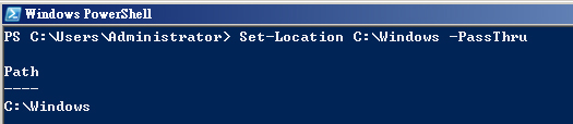 Windows PowerShell 環境預設的提示字元包含了現行目錄,因此成功執行 Set-Location 之後的目錄變化,會反映在提示字元。但如果提示字元未能顯示現行目錄,或其他任何想要確認 Set-Location 執行結果的情況,可以在 Set-Location 加上 -PassThru 參數,讓 Set-Location 執行之後傳回目前所在的工作目錄,例如: