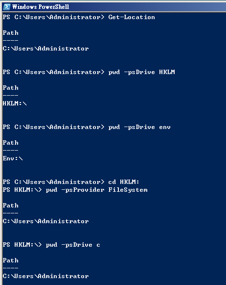 上述第一例沒有任何參數,因此會依預設顯示目前工作磁碟機的目錄,而由於目前所在的磁碟機是C,因此顯示 C:\Users\Administrator。其他例子分別以 -psDrive 和 -psProvider 參數,希望能顯示特定 PS 磁碟機或提供者的目前工作目錄。