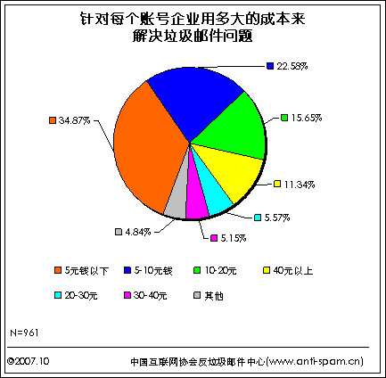 据中国互联网协会反垃圾邮件中心(www.anti-spam.cn)最新发布的2007年第三次反垃圾邮件状况调查报告中,在针对每个帐号企业将会用多大的成本来解决垃圾邮件这一问题作了深入调查。结果显示,面对日益肆虐的垃圾邮件,各企业也相继加大了成本来解决这一困扰。针对每个帐号企业约投入13.5元的费用来解决垃圾邮件问题。
