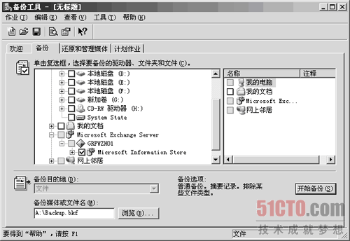 如果用户的计算机满足了其中的一个条件,则“备份”选项卡中就会出现一个名为“Microsoft Exchange Server”的选项,如图9-50所示。此选项将显示用户连接到的目录林中的所有Exchange服务器。如果在“备份”选项卡中看不到此选项,请选择【工具】→【远程存储】命令手动连接到网络上的Exchange服务器。