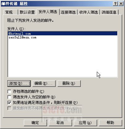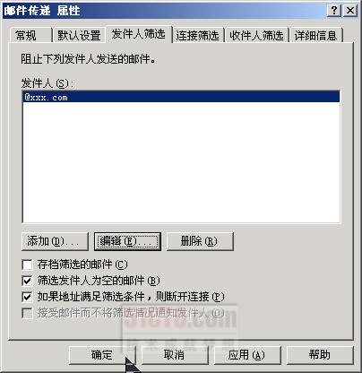 (3)如果要使Exchange将发件人筛选阻止的所有邮件保存到存档文件夹中(而不是自动删除被筛选掉的这些邮件),选择“存档筛选的邮件”复选框,归档文件夹为E:\Program Files\Exchsrvr\Mailroot\vsi n\archive 文件夹。