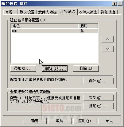 在“全部授受和拒绝列表配置”栏中,可以配置始终接受或拒绝来自特定IP地址的邮件,包括“全局接受列表”和“全局拒绝列表”,在“全局接受列表”中,用户将始终接受来自此列表中包含的所有已设置IP地址的邮件。Exchange在检查其他任何筛选器之前先检查此列表。如果连接方服务器的IP地址添加在全局接受列表中,Exchange将自动接受邮件而不检查其他任何筛选器。
