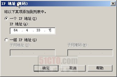 例如,在图6-51中单击“接受”按钮,在出现的对话框中单击“添加”按钮,打开如图6-52所示的“IP地址(掩码)”对话框,可以设置一个或一组IP地址,这样该Exchange服务器将可以接受该IP地址中的所有邮件,而不受其他筛选项目的限制。