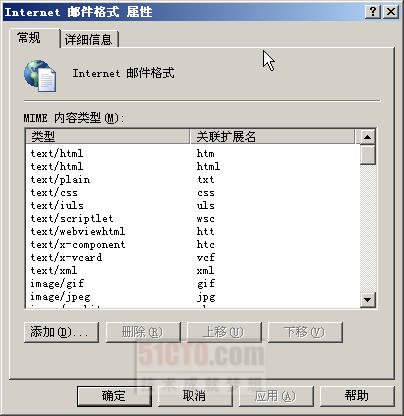 在如图6-40所示的窗口中,选取“Internet邮件格式”,单击鼠标右键,在出现的快捷菜单中选择“属性”命令,在出现的如图6-41所示的对话框中,列出了Exchange 2003邮件服务器的MIME内容类型,在此列表中可以添加新的MIME类型或删除选择的MIME类型。