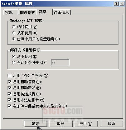 选取“高级”选项卡,在出现的如图6-46所示的对话框中,可以指定该策略何时使用Exchange RTF格式、使用该策略发送的邮件是否允许邮件文本自动换行,还可以指定向该策略中的一个或多个域中的用户发送哪些类型的自动响应。为安全起见,可以阻止向外部域发送自动响应。