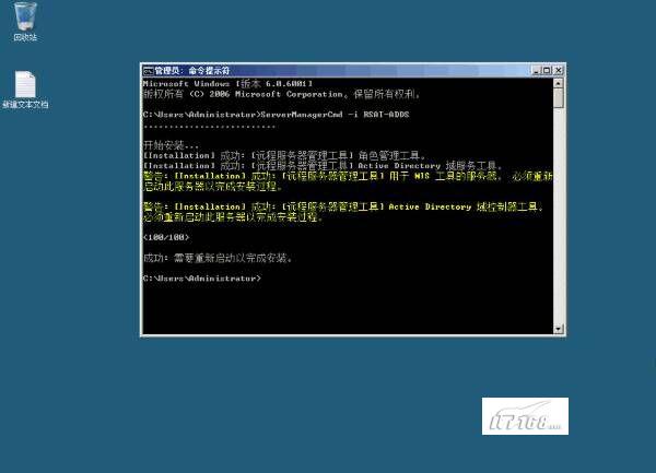 运行完第一条命令(ServerManagerCmd -i RSAT-ADDS)后,你需要重启起计算机来完成安装,如图1所示。
