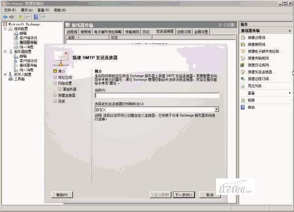 然后再右边的操作窗口中点击“新建发送连接器”,如图16,为发送器指定一个名称,点击下一步。