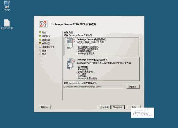 接下来选择“安装类型”,微软提供了两种选择:典型安装和自定义安装,根据你的需要选择,并且可以在这儿选择Exchange服务器的安装路径,如图7所示: