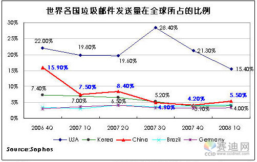而在全球垃圾邮件的传播问题上,土耳其首次名列三甲。全球约5.9%的垃圾邮件均来自于土耳机的僵尸电脑,而这个数字在在2007年第四季度仅为3.8%。除此之外,英国也榜上有名,排名第十位,比2007年第四季度上升了两名,且垃圾邮件传播总量从2.5%上升到了3.4%。