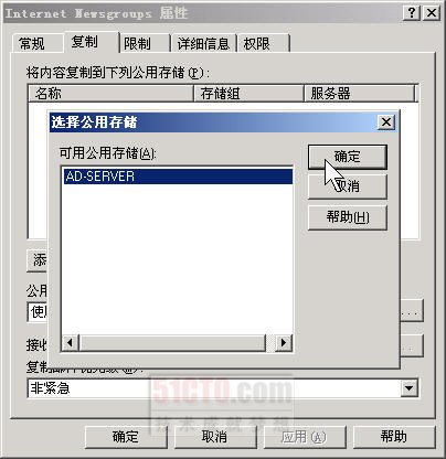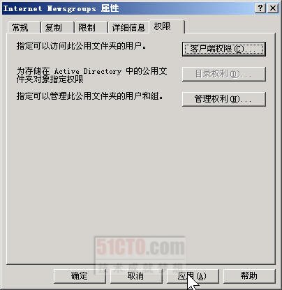(1)进入Exchange系统管理器,依次选择“管理组→第一个管理组→文件夹→共用文件夹→Internet Newsgroups”,如图6-65所示,单击鼠标右键,在从出现快捷菜单中选择“属性”命令,打开如图6-66所示的“Internet Newsgroups属性”对话框。