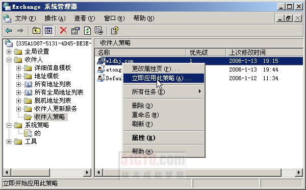 在“Exchange系统管理器”中,可以通过“收件人策略”来添加邮件的域名。下面,先来添加@wldhj.com邮件域名。