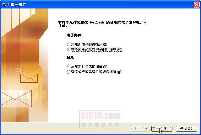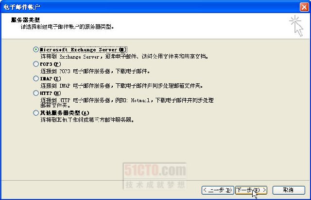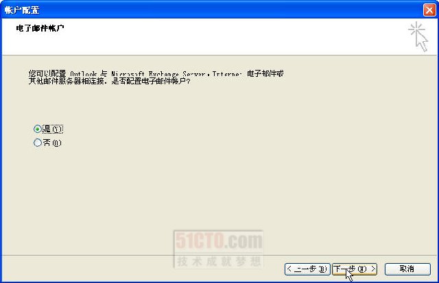(1)在一台已经加入企业Active Directory的计算机上运行Outlook 2003。如果是第一次使用Outlook 2003,将进入启动向导。在Outlook 2003启动向导中,单击“下一步”按钮,进入如图6-113所示的“电子邮件账户”对话框。