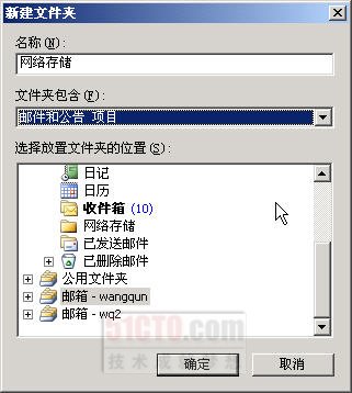 打开Outlook 2003,选择“文件→新建→文件夹”,打开如图6-128所示的对话框。在“名称”下方输入要创建的文件夹的名称(如“网络存储”),在“文件夹包含”下拉列表中选择“邮件和公告项目”,并在“选择放置文件夹的位置”下面列表中选择新文件夹的创建位置。