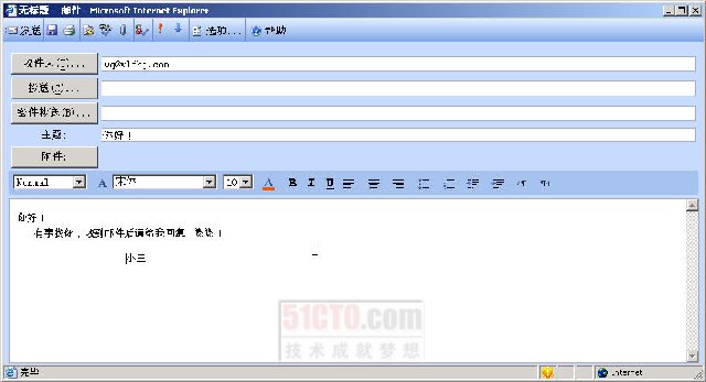 在如图6-133所示的窗口中选择“新建→邮件”,将打开如图6-134所示的发送邮件窗口。在该窗口中输入“收件人”的邮箱地址和相关的内容(包括附件),然后单击“发送”按钮进行发送。