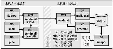 每种类型的收件人可能需要一个不同的代理。/bin/mail是用于本地用户的投递代理。/bin/sh是发给文件或程序的邮件最初的投递代理,投递到文件则在内部处理。sendmail的新近版本附带了更安全的本地投递代理,名为mail.local和smrsh(念做“smursh”)。www.procmail.org的procmail也可以用作本地投递代理,参见18.9.16节。类似地,如果您运行Cyrus imapd作为AA(访问代理),它还包括自己的本地投递代理。