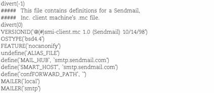 用于客户机的smi-client.mc文件相当简单。它使用邮件主机smtp.sendmail.com,这其实只是机器foon.sendmail.com的一个别名。使用一条MX记录(或者一条CNAME 记录)来指向邮件服务器是个好主意,当您希望移动自己的邮件主机时,这样改起来很容易。