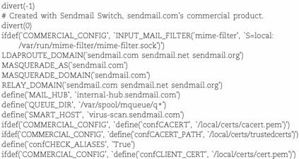 在这些例子中,我们都对原始文件进行了轻微修改,删去版权说明,添加临时注释,并删除行尾的m4 dnl指令。如果您把我们的任何例子用作自己的.mc文件的模板,请一定要删除行尾的注释。