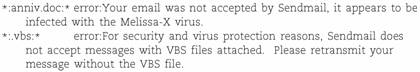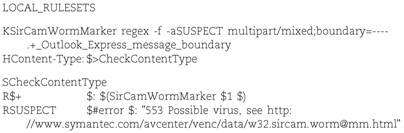 在2001年夏天,颇具破坏性的SirCam蠕虫到处肆虐。下面的片段是从sendmail软件发布中的knecht.mc文件里节录出来的,它能捕获这个蠕虫病毒。SirCam是首次能够产生随机信头内容的恶意病毒之一。如果不是它的作者犯了一个错误,使SirCam消息和真正的Outlook Express消息有了区别,那么用通常的工具都抓不到它。消息的内容相当常见(它请您就附带的附件给出意见),因此成了8.12版sendmail中新加的libmilter过滤机制的使用对象。在软件世界里没有产品级的可靠保障,似乎解决所有这些Microsoft病毒和蠕虫的做法就是卸载Windows并安装Linux!参考18.10.7节了解有关libmilter的更多信息。