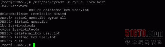 当用户cyrus取得了对信箱user.lbt的所有权限后,就可以用deletemailbox命令来删除该邮箱了。