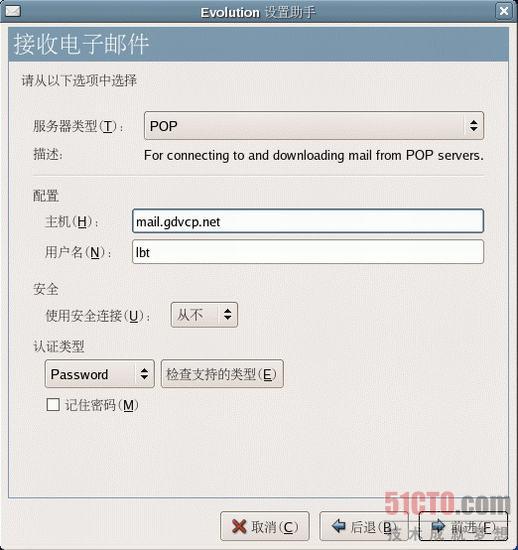 在“主机”文本框中输入收信邮件服务器主机的域名(如mail.gdvcp.net)或IP地址(如192.168.16.177),在“用户名”文本框中输入用户账户名(如lbt)。
