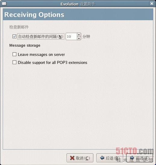 单击“前进”按钮,在打开的“Receiving Options”(接收选项)对话框中,可选中“自动检查新邮件的间隔”复选框,并根据个人需要设置其间隔时间,如图9-30所示。