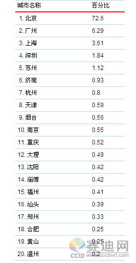 在中国,恶意程序感染率较高的五个城市排名依次为北京,广州,上海,深圳,苏州,他们占据了85%的感染流量。北京以高达72.6%的感染率居首位,而排在第二位的广州感染率仅有6.29%。超高的感染率已经使得北京成为世界范围内感染率最高的城市之一。
