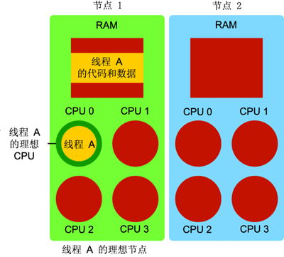 在 Windows Server 2003 中,当线程进行内存分配时,内存管理器在分配内存时将优先考虑在线程当前执行的节点中进行分配。如果线程暂时调度到非理想节点,则在此期间执行的所有分配操作都将在非理想节点中执行。所以,当线程最终回到其理想节点中执行时,它将不再像最初一样紧挨着所分配内存中存储的数据或代码。