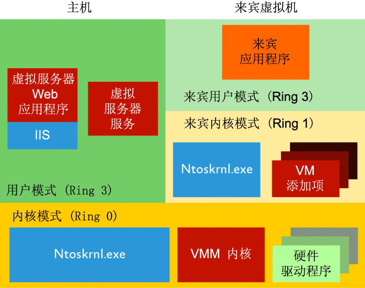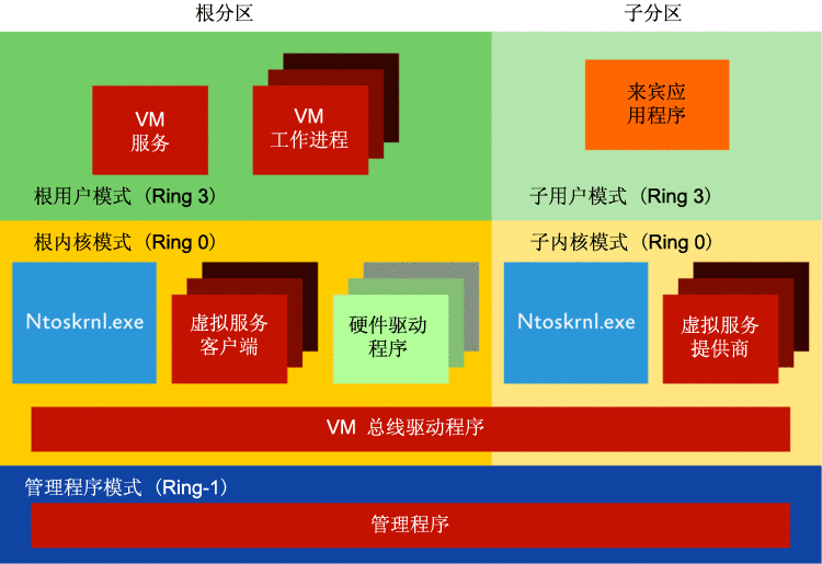 加载完成后,管理程序使用虚拟化扩展将自身插入到 Windows Server 2008 中。用户模式的应用程序使用 x64 处理器的 Ring 3 权限级别,而内核模式代码则在 Ring 0 上运行,因此管理程序实际是在概念权限级别 Ring -1 上运行,因为它可控制 Ring 0 上运行的代码的执行环境。
