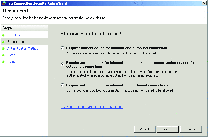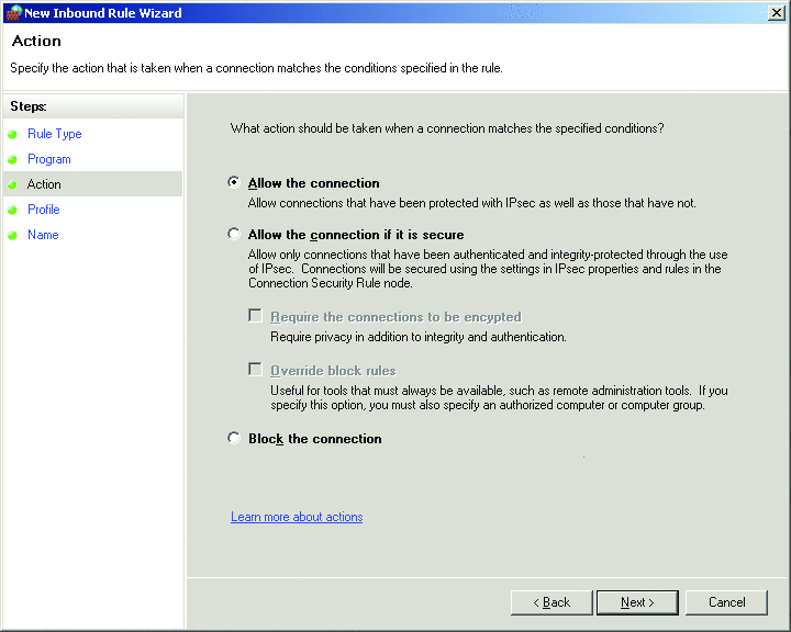 如图 1 所示,在定义入站或出站防火墙过滤器应采取的具体操作时,您可从三个选项中进行选择:允许、阻隔或仅在安全时允许。选中“Allow the connection if it is secure”(在安全情况下允许连接)时,Windows 防火墙会利用 IPsec 的主机对主机网络验证功能来确定:基于您已定义的策略,是否应批准主机或用户的连接请求。您可以使用防火墙规则设定哪些用户、计算机和组有权进行连接。值得注意的是,这增加了一个附加保护层,从而对现有的操作系统和应用程序级访问控制起到了支持作用。