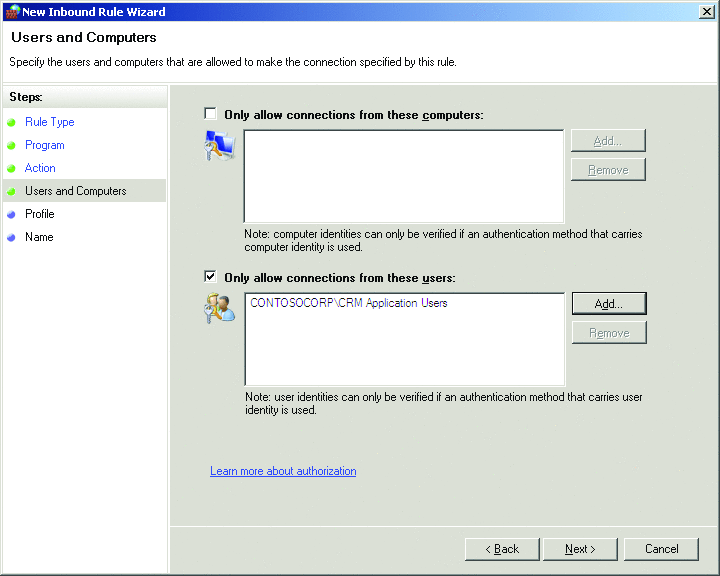 返回到 CRM 示例:管理员可以选中“Allow the connection if it is secure”(在安全情况下允许连接)选项,为运行公司 CRM 应用程序(通过程序的可执行文件或服务端口)的服务器创建入站规则。在相同的防火墙策略内,管理员可以指定只有“CRM Application Users”(CRM 应用程序用户)组的成员可以连接到此网络应用程序,如图 2 中所示。如果您采用此相同概念并将其扩大到您网络上所有受控计算机之间的网络通信,则您的策略驱动网络访问政策中现在又会新增一个“服务器和域隔离”层。
